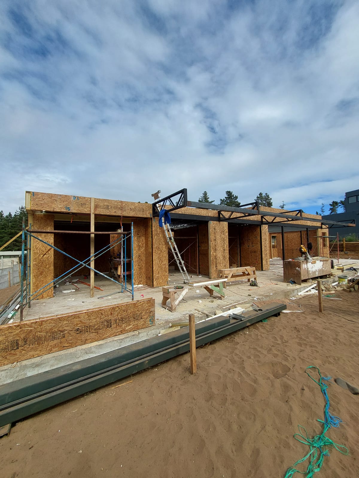 - Muros perimetrales y coronación doble altura con paneles SIP OSB LP APA PROTEC de 11.1 mm y 114 mm de espesor