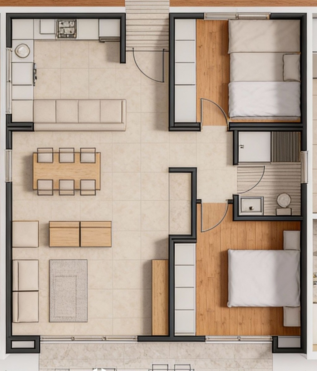 Vivienda de un piso con cubierta a dos aguas, diseñada para un montaje eficiente y un alto desempeño térmico. Su distribución interior prioriza espacios funcionales y bien iluminados, ideal para familias pequeñas o como primera vivienda en parcela o entorno urbano.