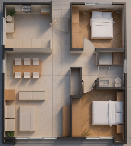 La distribución contempla dos dormitorios, un baño, living y comedor integrados con la cocina, generando un espacio central amplio y luminoso. El diseño optimiza el uso del espacio, siendo ideal como primera vivienda, casa de parcela o proyecto de inversión.