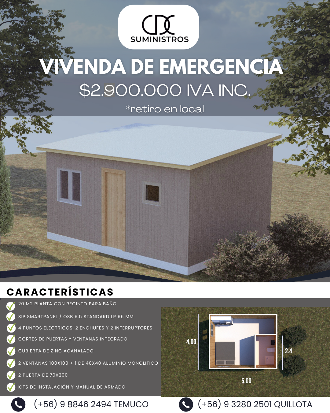 VIVIENDA DE EMERGENCIA SMARTPANEL EXTERIOR OSB STANDAR INTERIOR CAIDA 1 AGUAS 5X4 mts. Con recinto para baño
