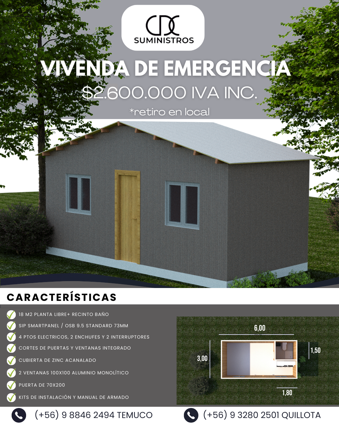 VIVIENDA DE EMERGENCIA SMARTPANEL EXTERIOR OSB STANDAR INTERIOR CAIDA 2 AGUAS 6×3 mts. Con recinto para baño